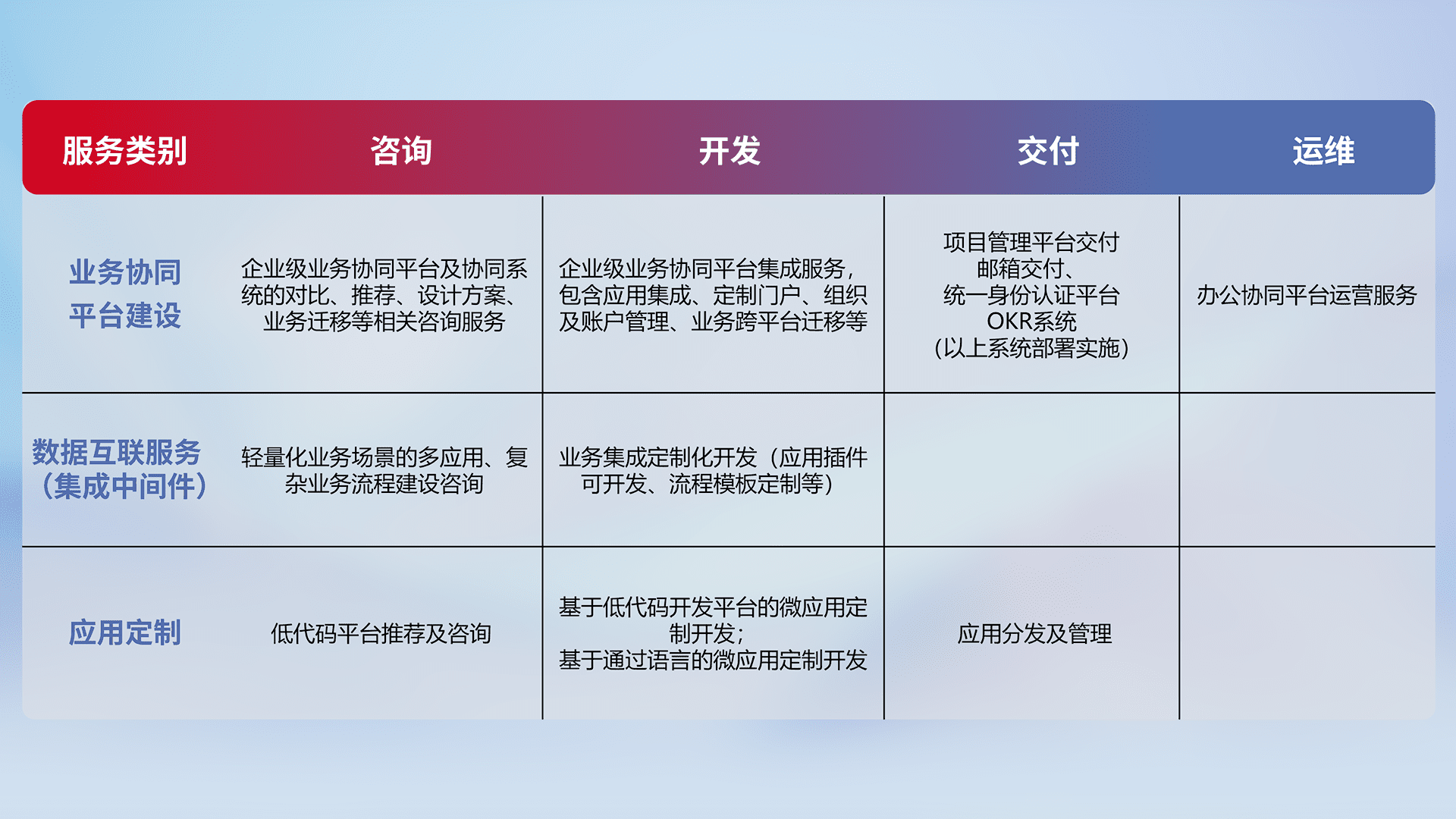 针对钉钉、、、、企微、、、IDaas等平台级产品提供产品的规划、、、、方案、、、、交付、、定制化开发等服务,,,实现如统一协同办公、、、、智能客户服务、、混合会议管理、、、智能数据查询、、、等业务场景,,实现数字化转型。。。